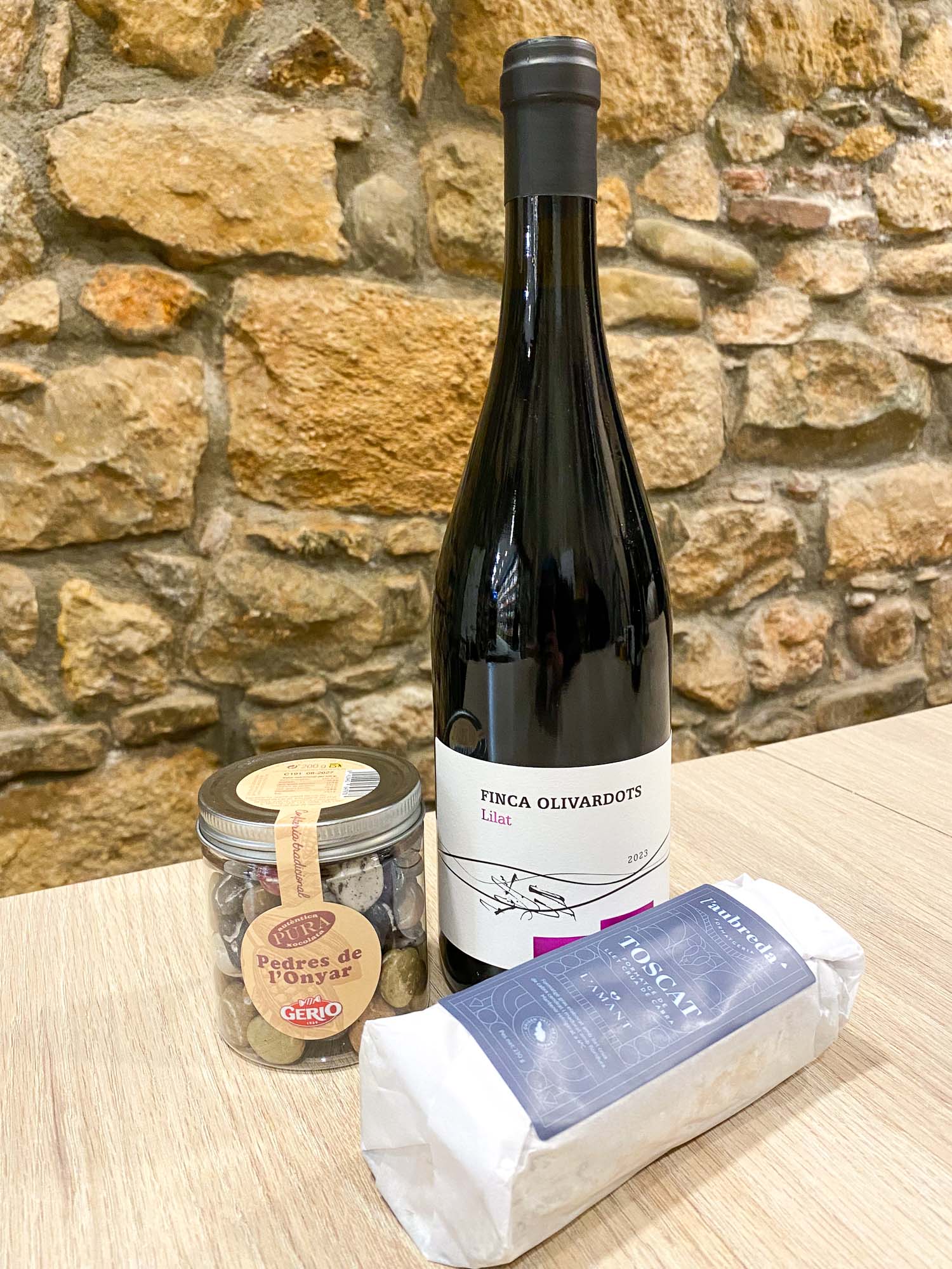 Lot amb una ampolla de vi, una peça de formatge i un complement. Tot triat i seleccionat pel teu sommelier de capçalera.
